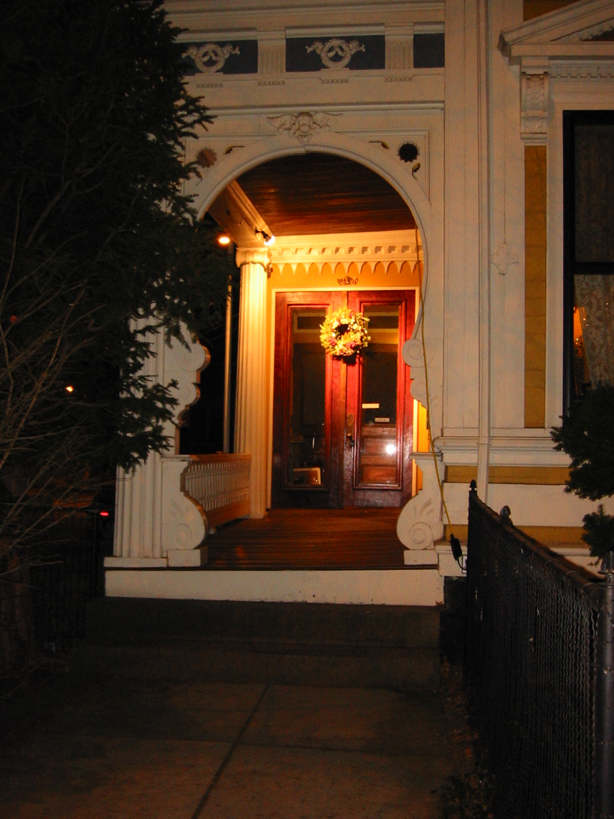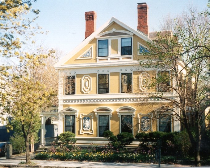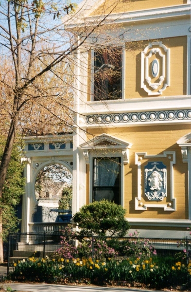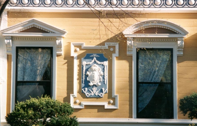 After the 60 year old mansion was moved to a fine new foundation, it was re-decorated inside and out according to then-current taste. Thus the Greek-Revival exterior had numerous medallions and decorations affixed, the porches had keyhole arches attached, and many small window panes were replaced with large glass panes. This creates a structure that does not conform to the norms of any period, since the result is much too elaborate for Greek Revival tastes, but the house lacks the vertical architecture and specific features (towers, tall windows) normal in the true Victorians in the neighborhood.