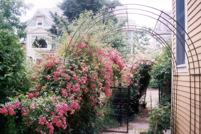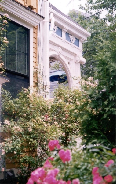 Some of the roses have grown to the second floor and frame the windows of the red parlor. They are spectacular and fragrant from inside and out.