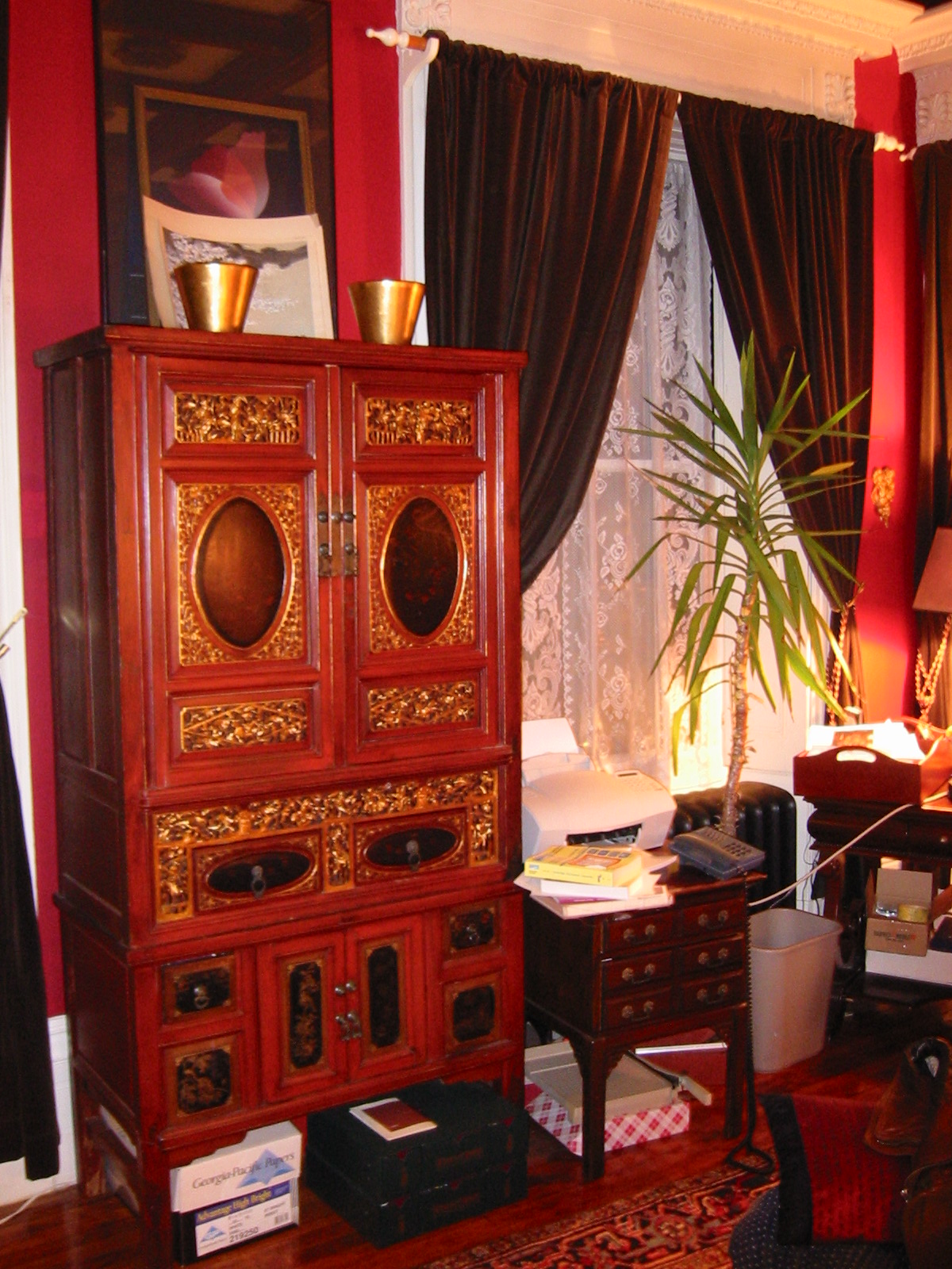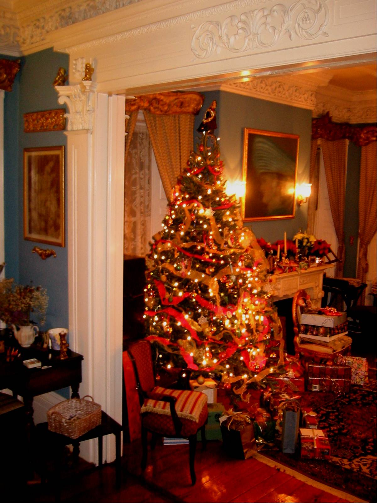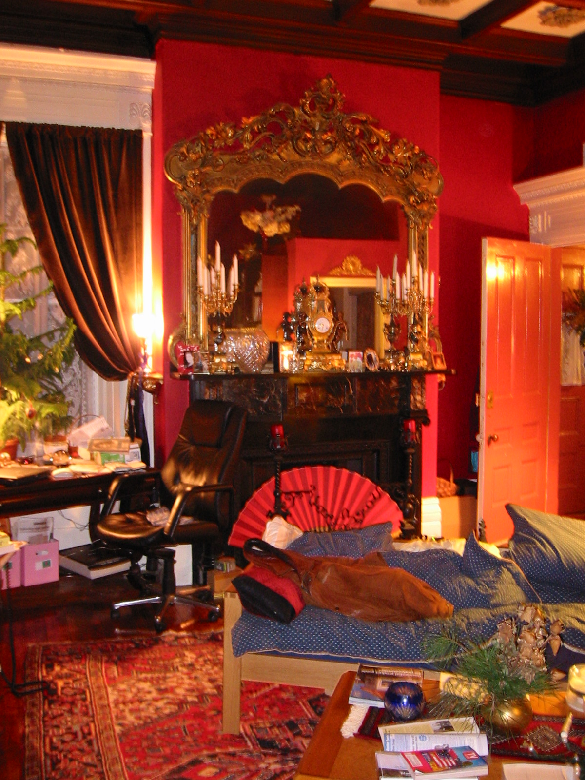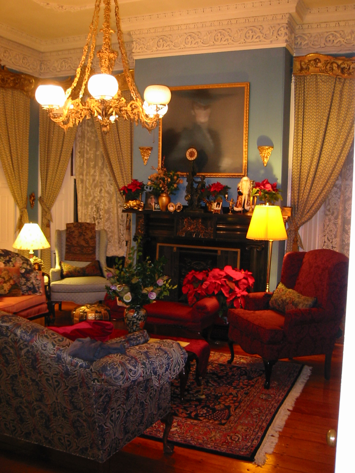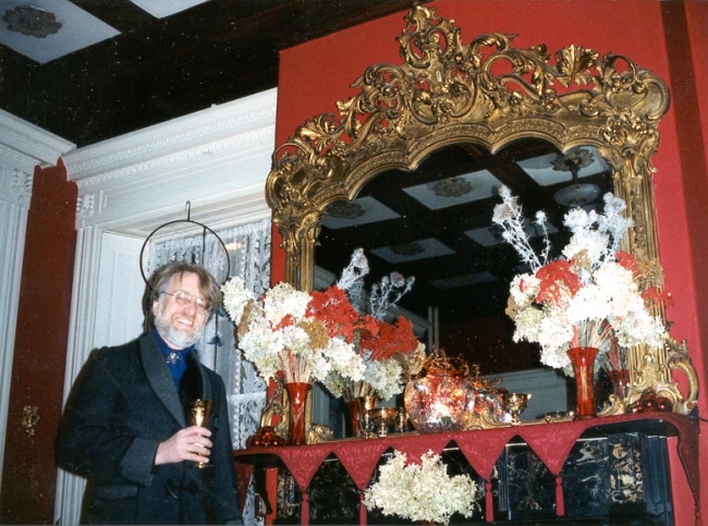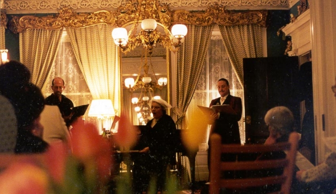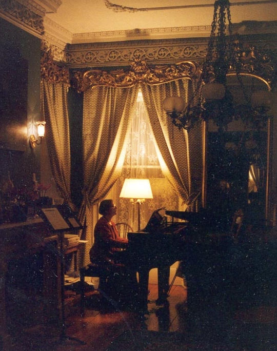 The entire 40 foot frontage of the house is a double parlor where my wife Jane Struss, gives voice lessons and where we frequently have music parties. These events originate as final dress rehearsals for performances elsewhere, or as fund raisers for music groups, but are always an ultimate Victorian music experience. Note on the pictures how the elaborate gilded pelmets over the windows merge with the crown over the pier glass mirrors and reflect the elaborate gilded chandeliers. Similar decorations in the second parlor reflect back the reflection, producing the infinite reflections of the beaux art ballroom. We use one parlor as the 'stage' and the other for the audience of 30.
