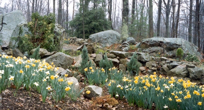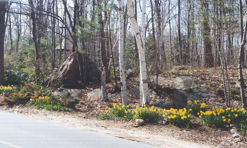 The street view of the garden is so much liked by the community that when my next door neighbors was doing some building their friends would ask them "You arent going to disturb that beautiful garden, are you?" Here I show it blooming merrily with daffodils in the spring, to be followed by daylillies later in the season.