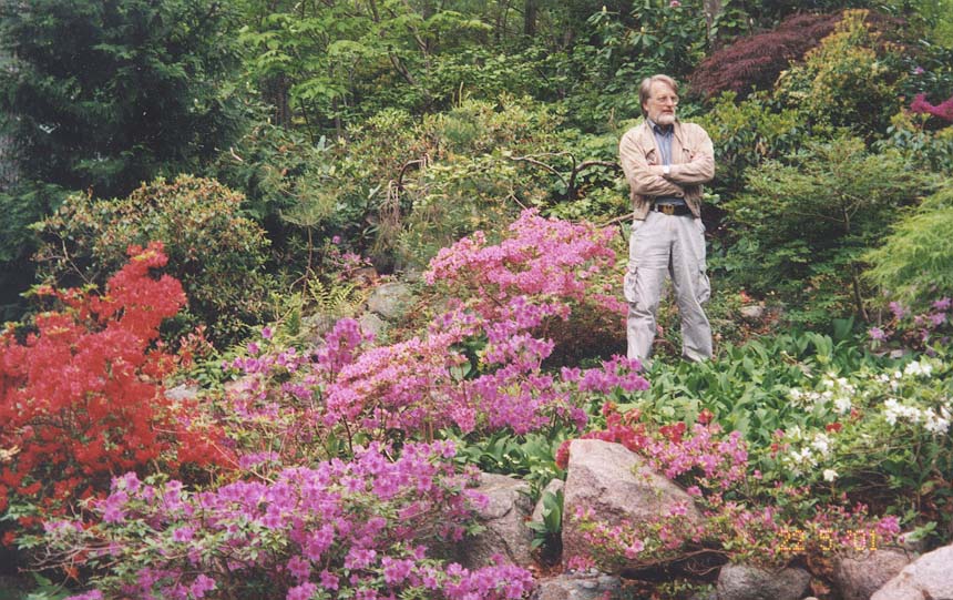 Here the gardener is surrounded by his springtime harvest of flowering rhodedendrons and azaleas. I am so luckey that these shrubs that grow so well in coastal New England all bloom in the springtime, when I most enjoy the new garden year.