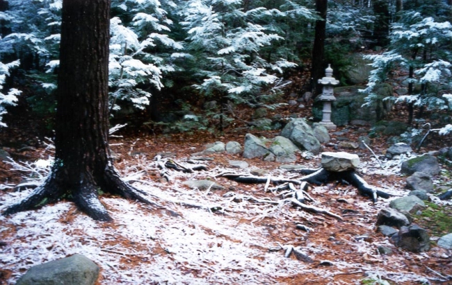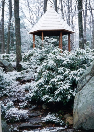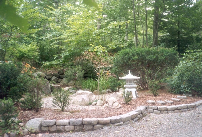 Because we have 5 weeks of winter in Boston, the garden was designed to have all-season interest, with many features in Karensansui style, with dry rock water features embellished in textured evergreen rhodedendron, holley, pieris, and azalea. The garden also incorporates feng shui princilpes and accordingly the house is set exactly facing south, with a view to a crimson rising phoenix. The east side is dominated by its roadway, and the west by the brook. On the north is a giant sleeping turtle.
