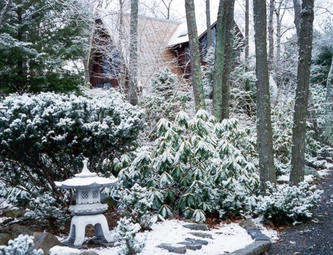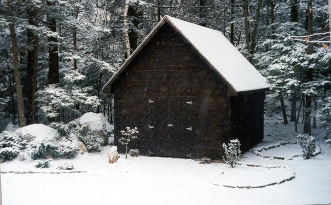 I saw the need for a garden shed as a design opportunity, and had a custom structure built by a shed-maker with small windows tucked up right under the roof, and with big overhanging eaves. This is sited next to my turtle sculpture, and surrounded by its pond and contemplation rock grouping. A photograph shows how charming it can be even in winter.
