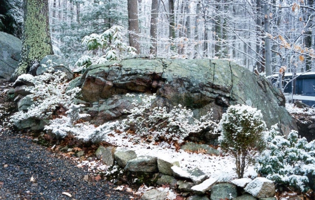 The garden has many fine granite boulders deposited by a recent glacier, and these have been featured in the design. Matching granite cobblestones were provided by the 'Big Dig' construction project in Boston, which took out many of tho old Boston streets. Every night I would dig through the construction rubble and collect up the old cobblestones; I could only carry 55 per night, distributed on the front and rear seats and the trunk of my car according to the engineered design of the VW rabbit. Every night the car springs would bottom out at two road bumps on my route home. The cobblestones all have a rounded face marking the side that faced upward and was ground smooth by the iron wagon wheels.